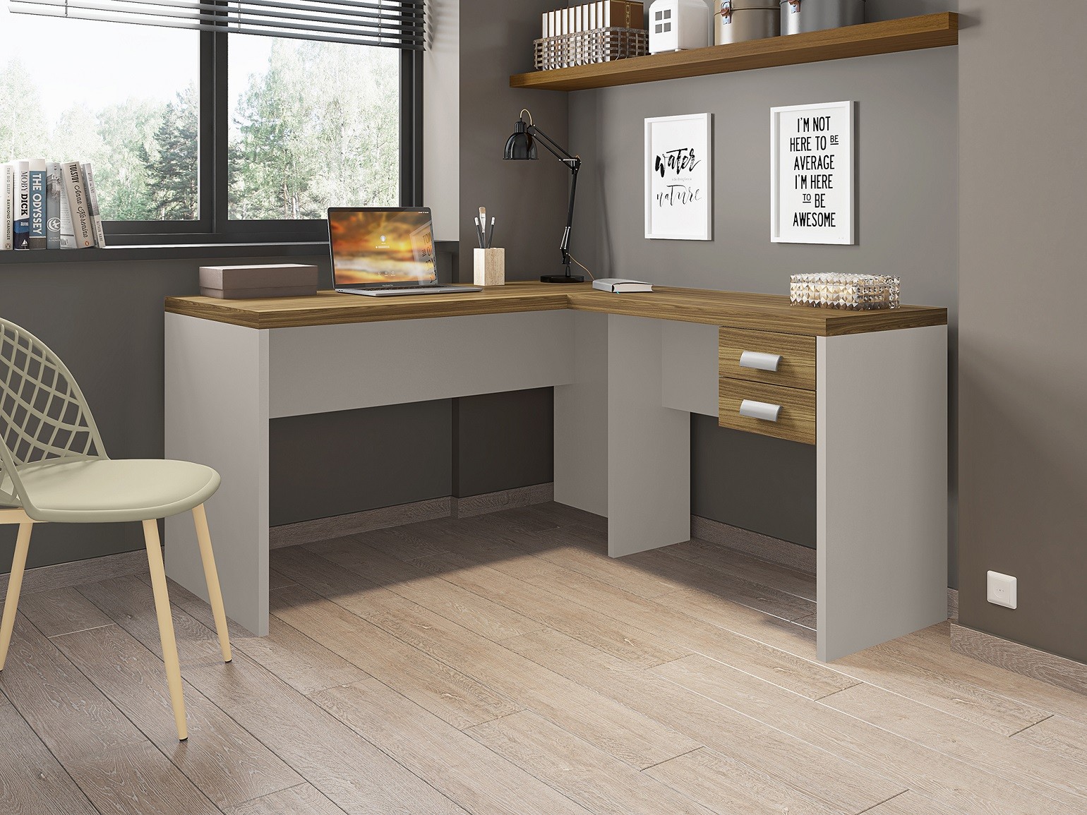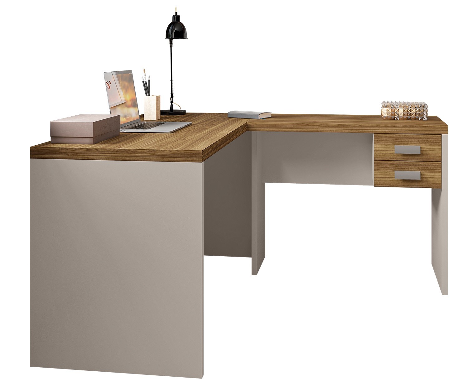 El escritorio oficina studio 136 combina dos superficies de trabajo en configuración en L: una mesa principal de 136 cm y una auxiliar de 90 cm reversible. Incluye cajonera de 2 cajones con guías telescópicas metálicas para almacenamiento eficiente. El bilaminado de 40 mm en la tapa garantiza resistencia al uso diario intensivo.