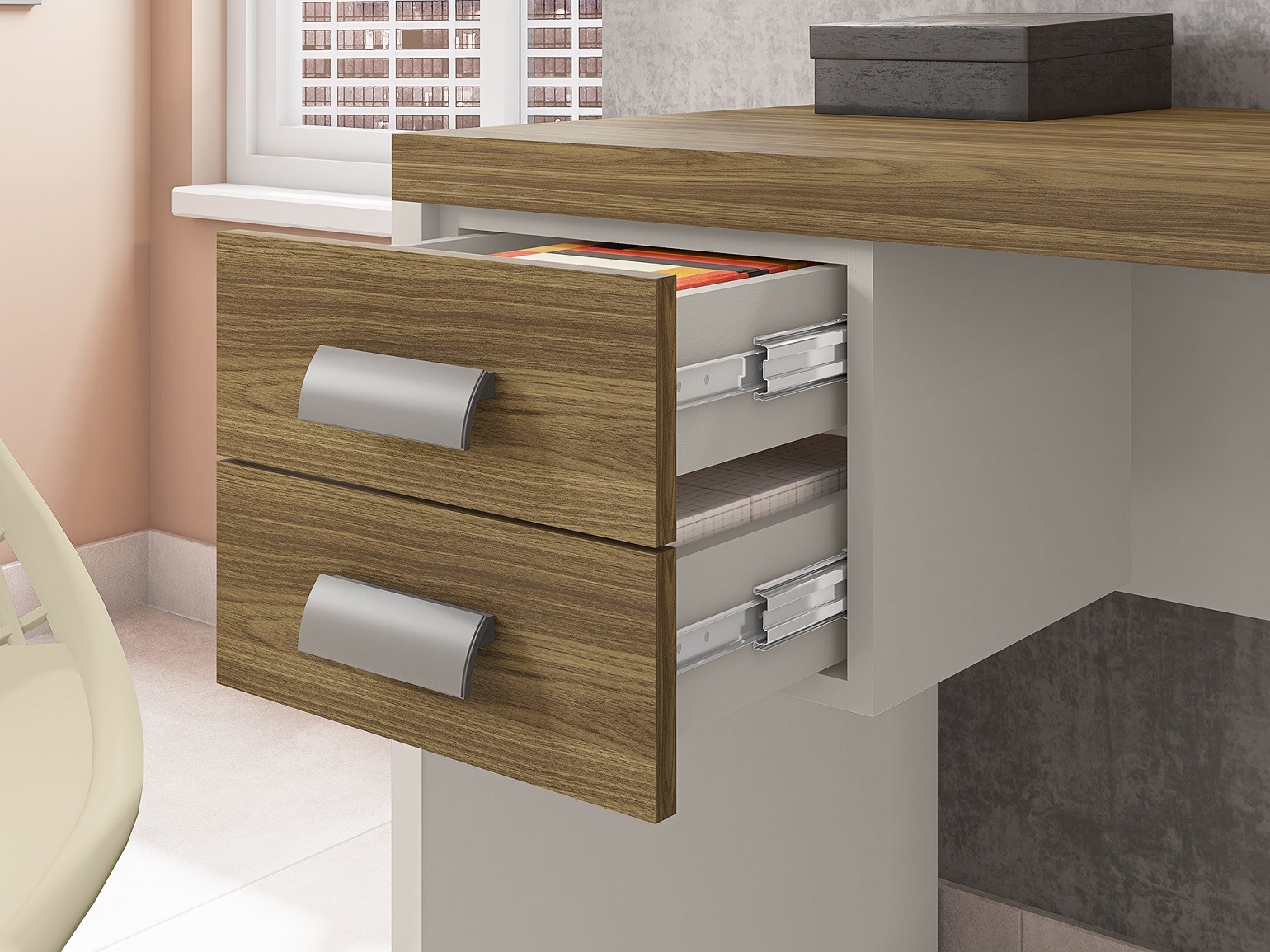 La doble superficie de trabajo permite separar tareas: pantalla y teclado en la zona principal, documentos o portátil en la auxiliar. Los cajones con guías telescópicas soportan archivadores y material de oficina sin perder estabilidad. Con 75 cm de altura estándar, mantiene una postura correcta durante horas de trabajo continuo.