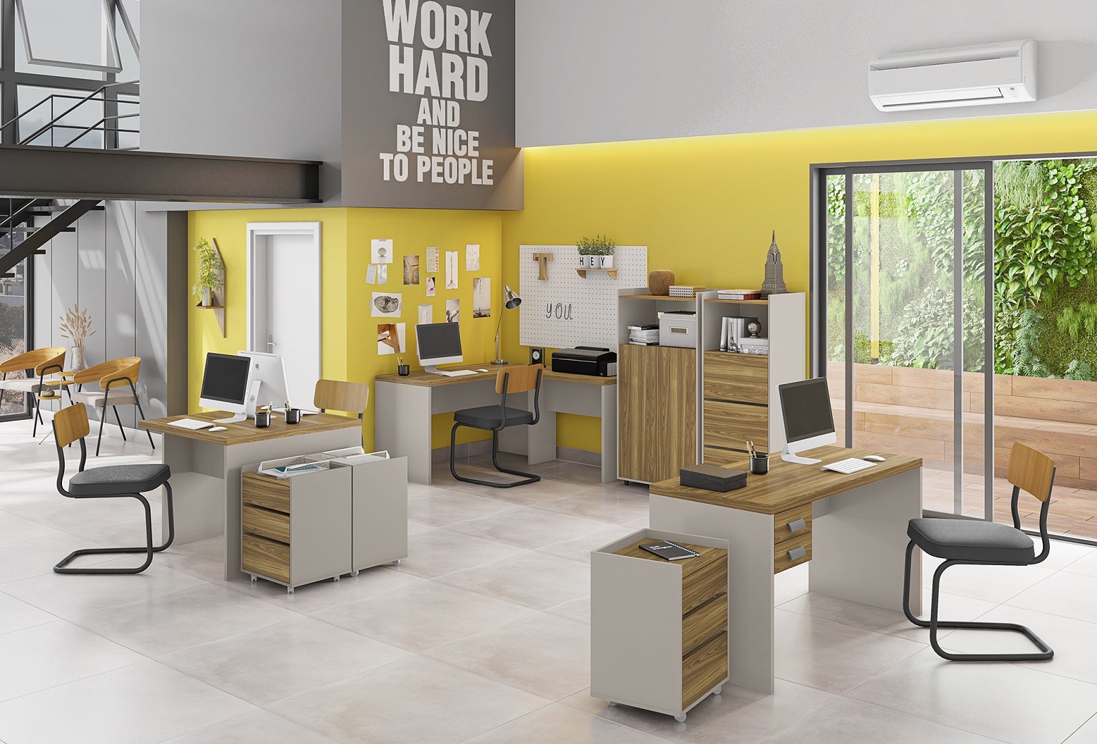 Los laterales de bilaminado de 25 mm y la tapa reforzada de 40 mm aseguran durabilidad ante el uso diario en oficinas. El acabado bicolor miel y cacao aporta calidez sin perder presencia profesional. El sistema requiere montaje en kit con instrucciones incluidas. Disponible con armarios y cajoneras adicionales a juego para completar tu espacio de trabajo.