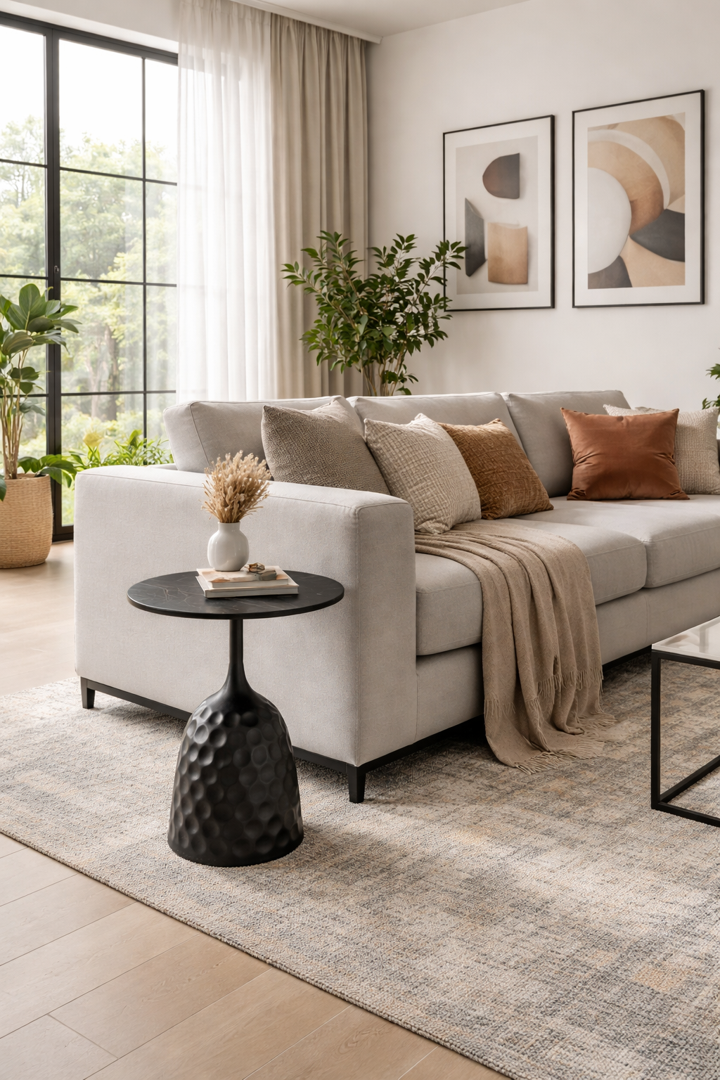 Con sus 61 cm de altura, la mesa auxiliar CAVEZZO presenta la elevación ideal para usar cómodamente desde el sofá o la cama. Su diseño circular favorece la circulación en espacios reducidos al no presentar esquinas, y el diámetro de 50 cm proporciona superficie suficiente sin invadir el paso. El acabado negro total (tanto en tapa como en estructura) crea un efecto monocromático elegante que funciona como elemento de contraste en salones claros o se integra discretamente en ambientes oscuros. Esta versatilidad estética, unida a su practicidad funcional, explica por qué las mesas auxiliares redondas son tendencia en interiorismo contemporáneo.