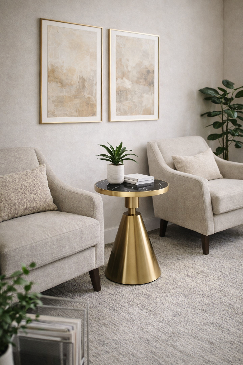 El diseño de esta mesa permite múltiples combinaciones decorativas que realzan su belleza. El dorado combina perfectamente con tonos neutros como beige, gris o blanco, creando ambientes serenos y elegantes. También hace match con colores más atrevidos como verde esmeralda, azul petróleo o burdeos, aportando un toque glamuroso a espacios con personalidad. Puedes colocar sobre ella una lámpara de sobremesa con base transparente o dorada, que refuerce la luz y el brillo. Un jarrón con flores naturales o secas en tonos tierra contrasta bellamente con el negro de la tapa. Libros apilados decorativos, velas aromáticas o una bandeja dorada con tus objetos favoritos son complementos ideales. Si buscas un ambiente más minimalista, menos es más: una sola pieza decorativa de calidad bastará para resaltar la belleza intrínseca de esta mesa auxiliar.