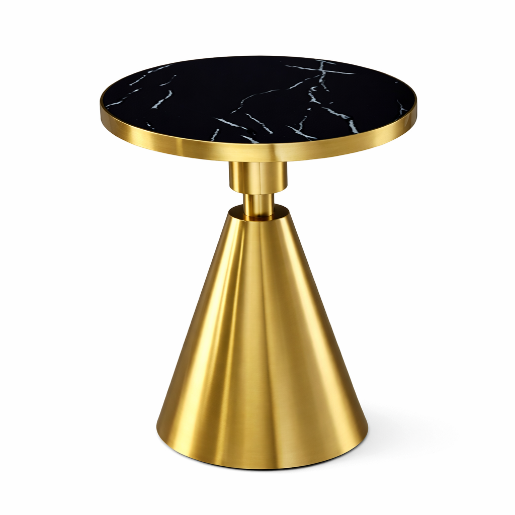 La mesa auxiliar JASSY NE destaca por la calidad de sus materiales y su cuidado proceso de fabricación. El contraste entre el dorado del armazón y el negro veteado de la tapa crea un efecto visual impactante que realza cualquier estancia.