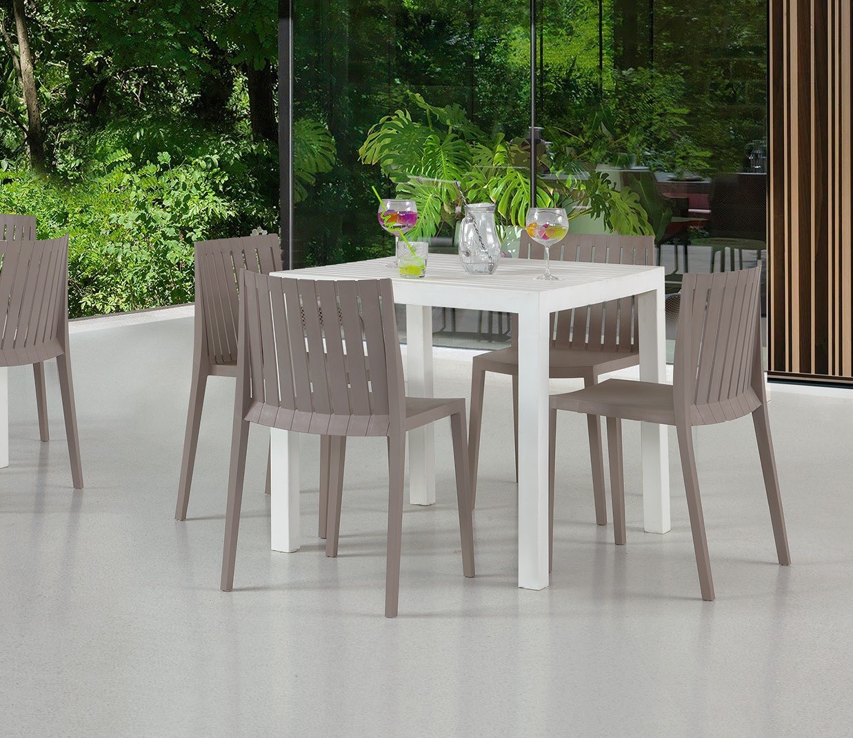 Completamente apta para hostelería. El polipropileno reforzado con fibra de vidrio soporta uso intensivo diario. Su tratamiento anti UV garantiza durabilidad en terrazas expuestas al sol. Disponemos de suministro en pallets de 32 unidades para proyectos grandes.