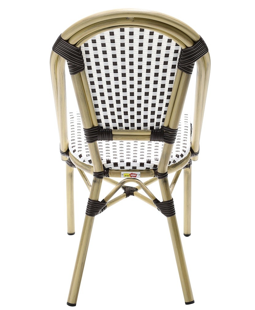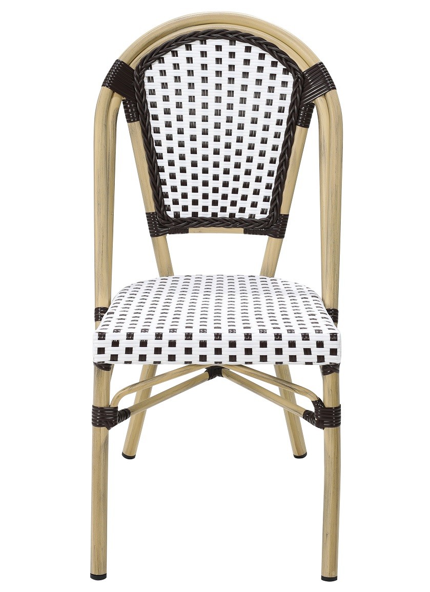 La silla de exterior Paris 47 marrón apilable combina armazón de aluminio reforzado con ratán sintético en tonos blanco y marrón. Homologada para uso intensivo, soporta el día a día de terrazas profesionales y espacios domésticos. Su capacidad de apilado optimiza el almacenamiento cuando no está en uso.