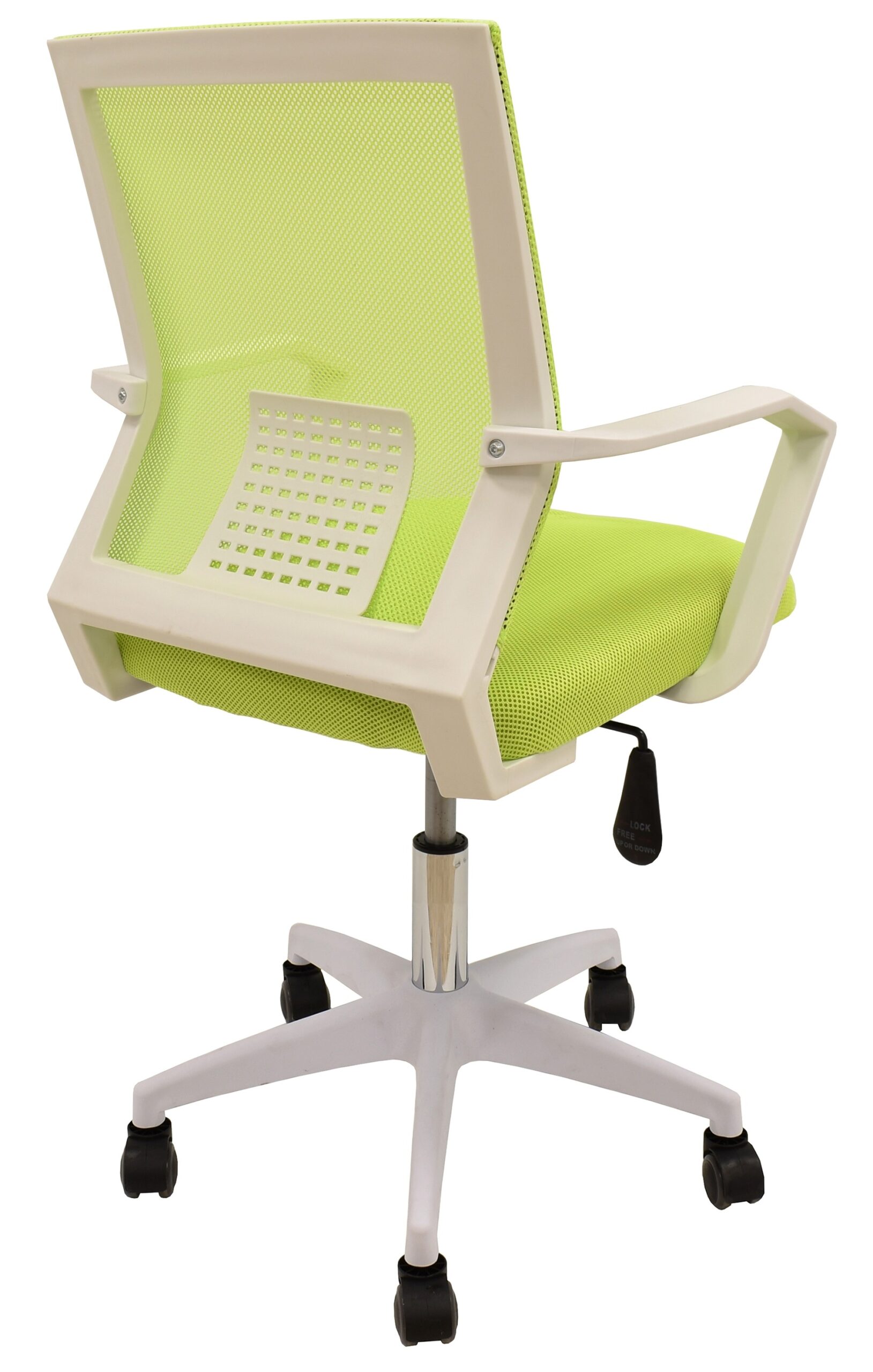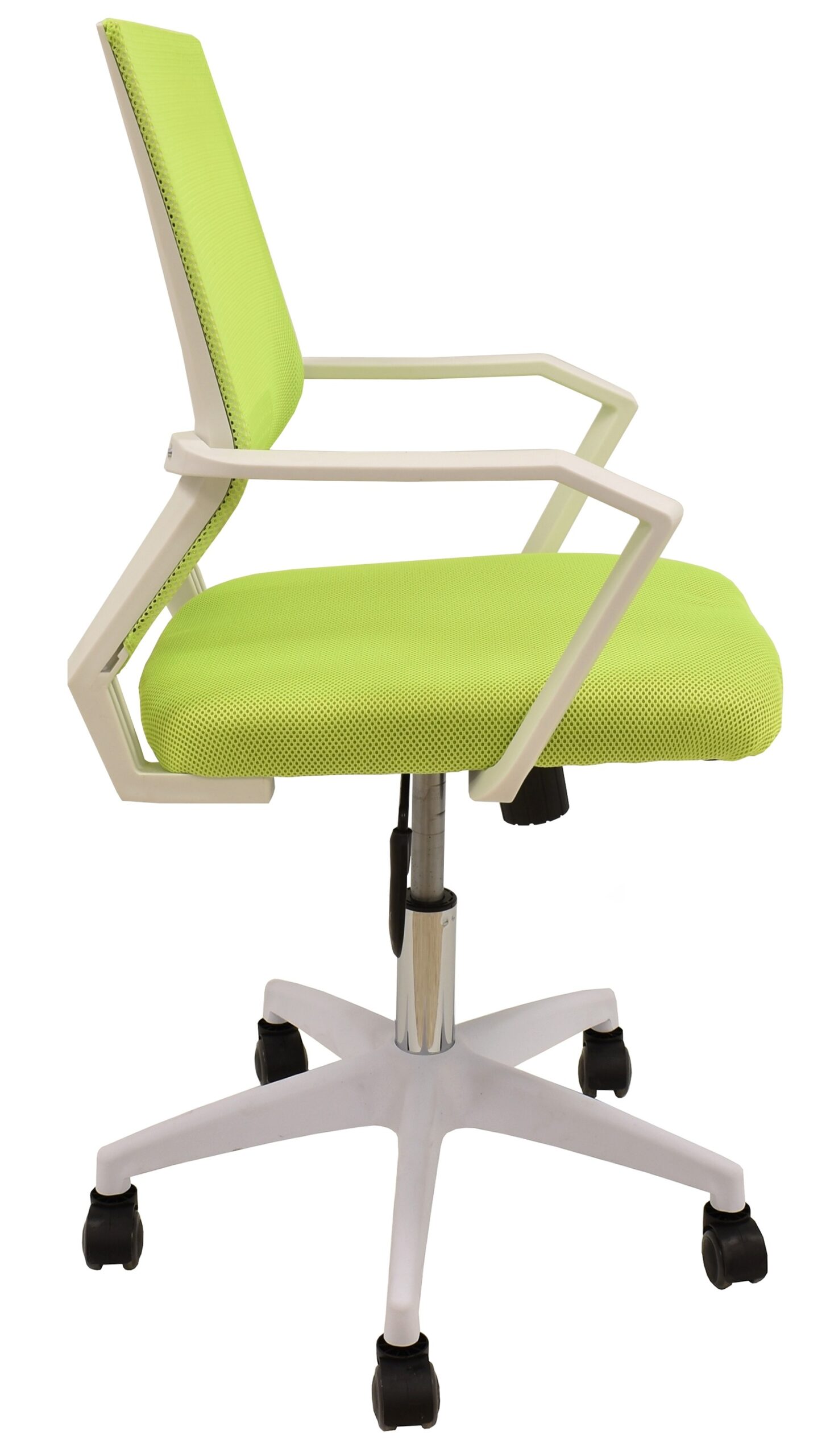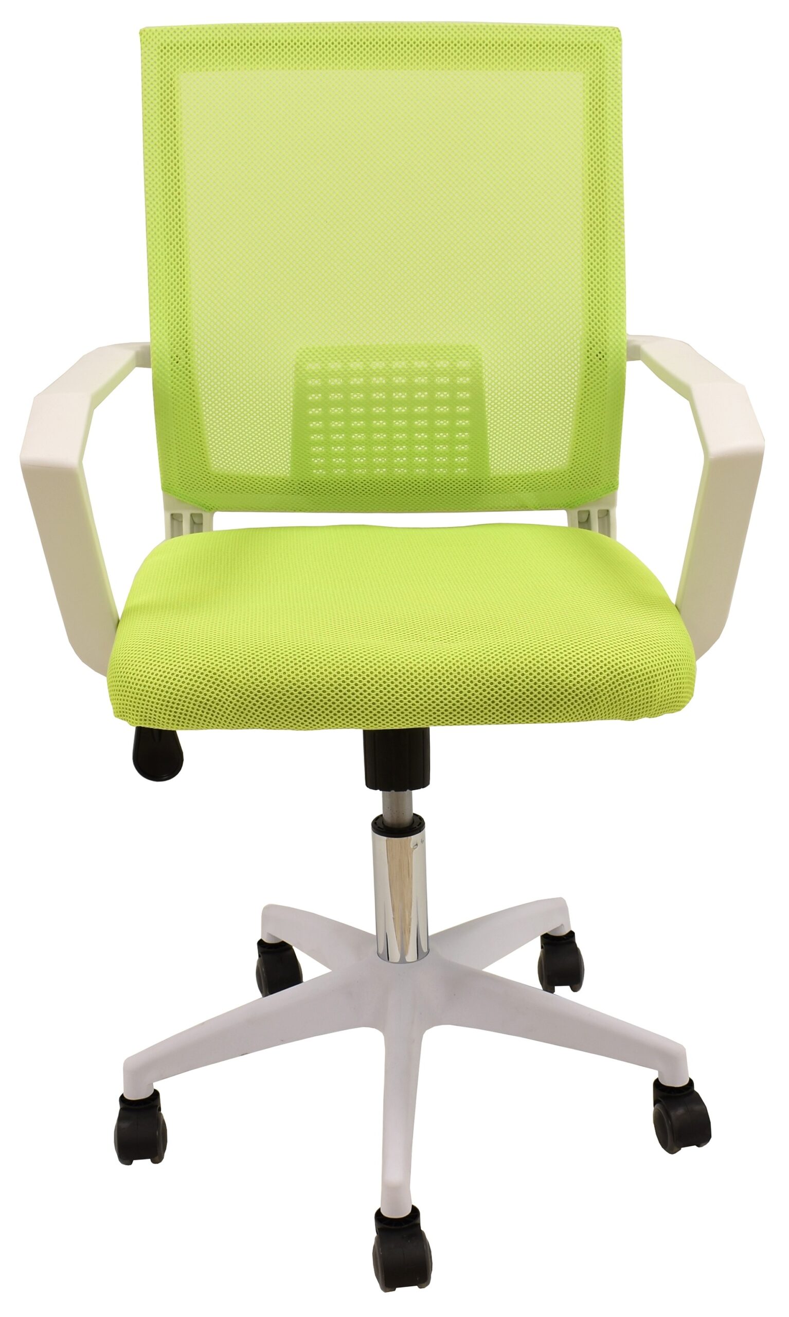 - Material: Base de nylon resistente, respaldo en malla verde, asiento en tejido mesh verde pistacho, estructura blanca