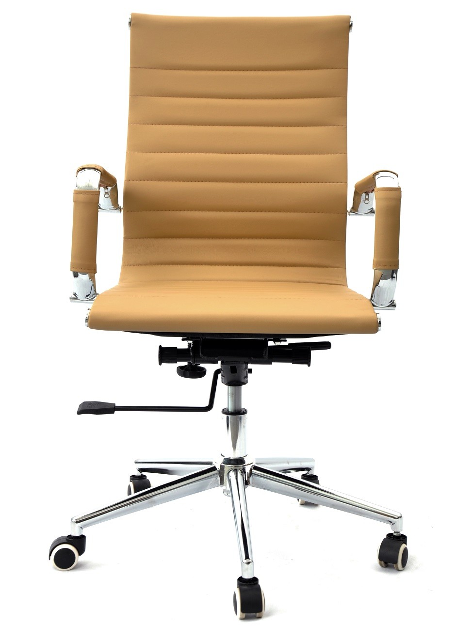 La base de cinco radios en acero cromado garantiza estabilidad superior frente a las bases de plástico convencionales. Los brazos cromados soportan el peso sin deformarse. El respaldo medio incluye las mismas costuras decorativas en su parte trasera, ofreciendo un acabado cuidado desde todos los ángulos. Este sillón giratorio cumple con normativa UNE según certificación de laboratorio internacional homologado.