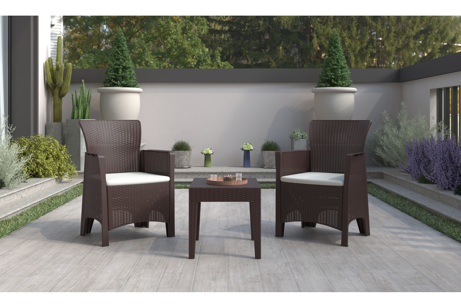 La silla de plastico ileón 80 beige sillon combina diseño tipo rattán con la resistencia del polipropileno marrón chocolate. Incluye cojín beige y tratamientos anti UV y antiestático. Fabricada mediante inyección asistida por gas, garantiza durabilidad en hostelería y uso doméstico intensivo tanto en terrazas como en interiores.