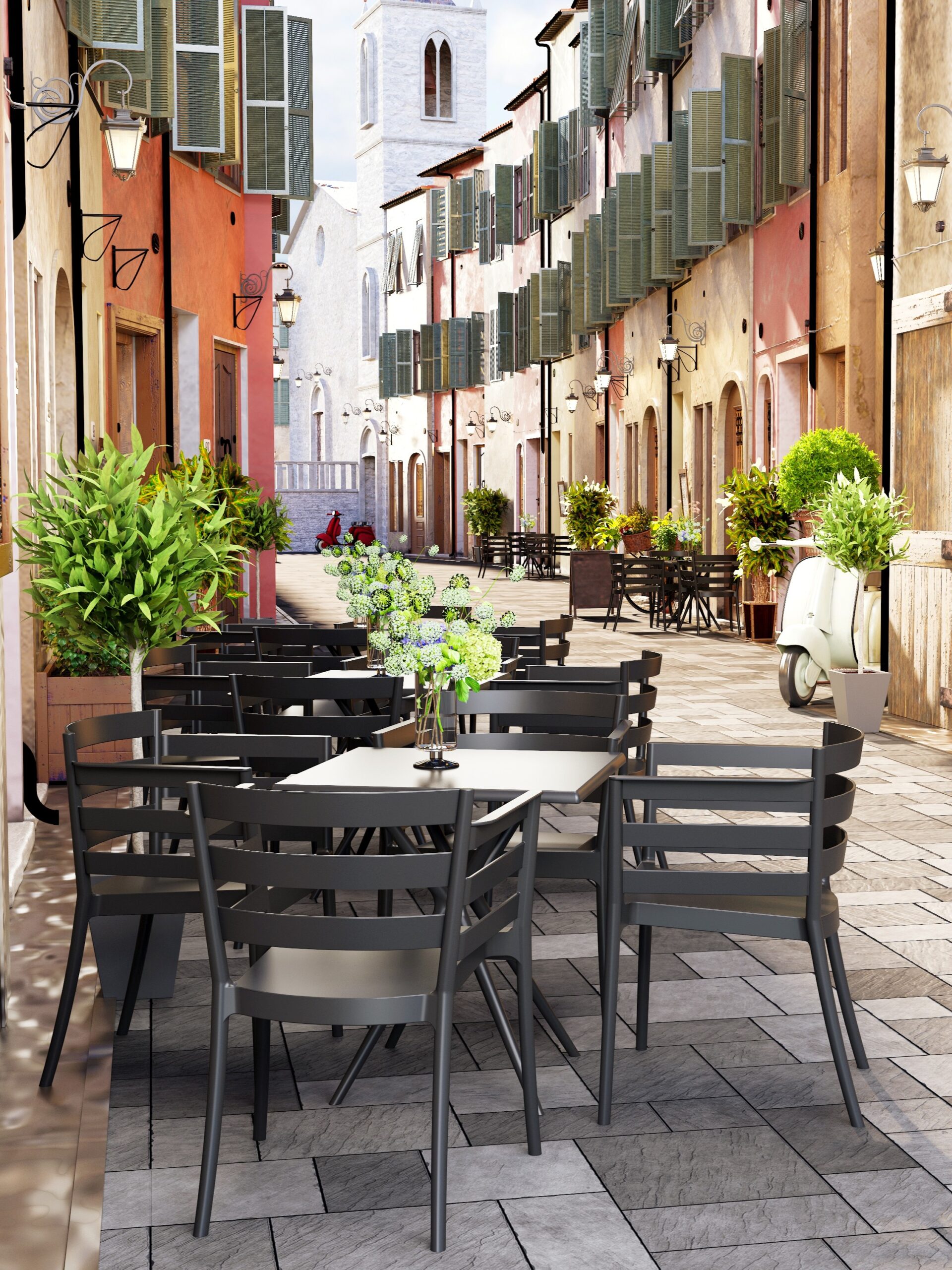 Aunque está pensada principalmente para exteriores, el modelo funciona igualmente bien en comedores modernos, salas polivalentes y espacios comerciales interiores. El color antracita neutral combina con diferentes estilos decorativos sin saturar visualmente el ambiente. Su peso ligero permite moverla fácilmente para reorganizar distribuciones sin esfuerzo físico.
