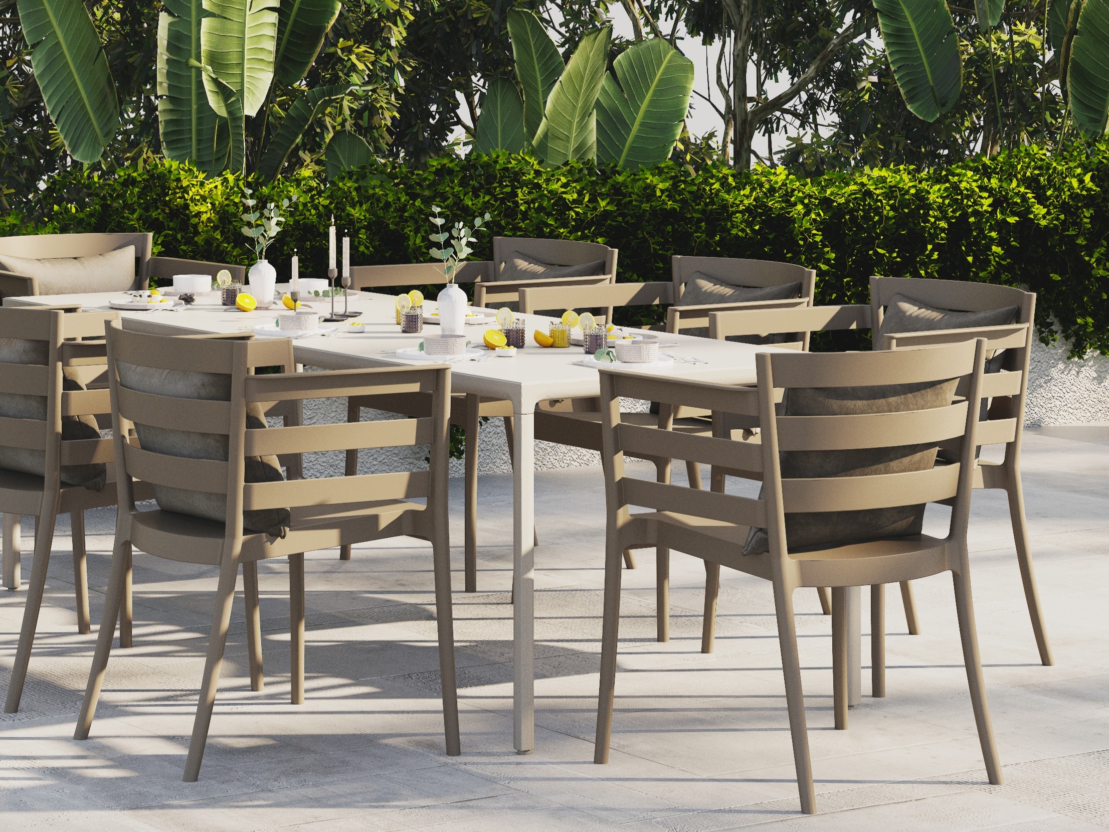 La capacidad de apilar estas unidades (se embalan de 4 en 4, ocupando solo 0,376 m³) optimiza el almacenamiento cuando no se usan. Ideal para negocios de hostelería que necesitan reorganizar espacios según temporada o eventos, y para hogares con jardines donde se guarda el mobiliario en invierno. Su diseño permite apilar varias unidades de forma estable sin dañar el acabado.