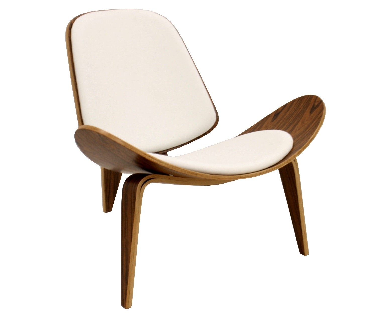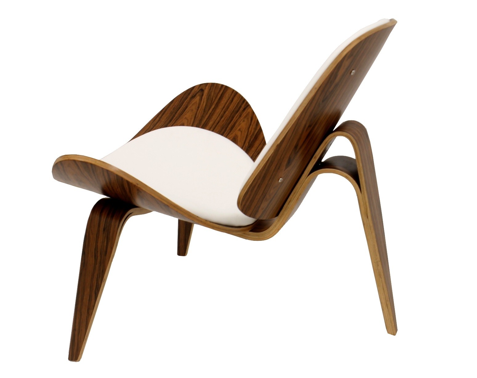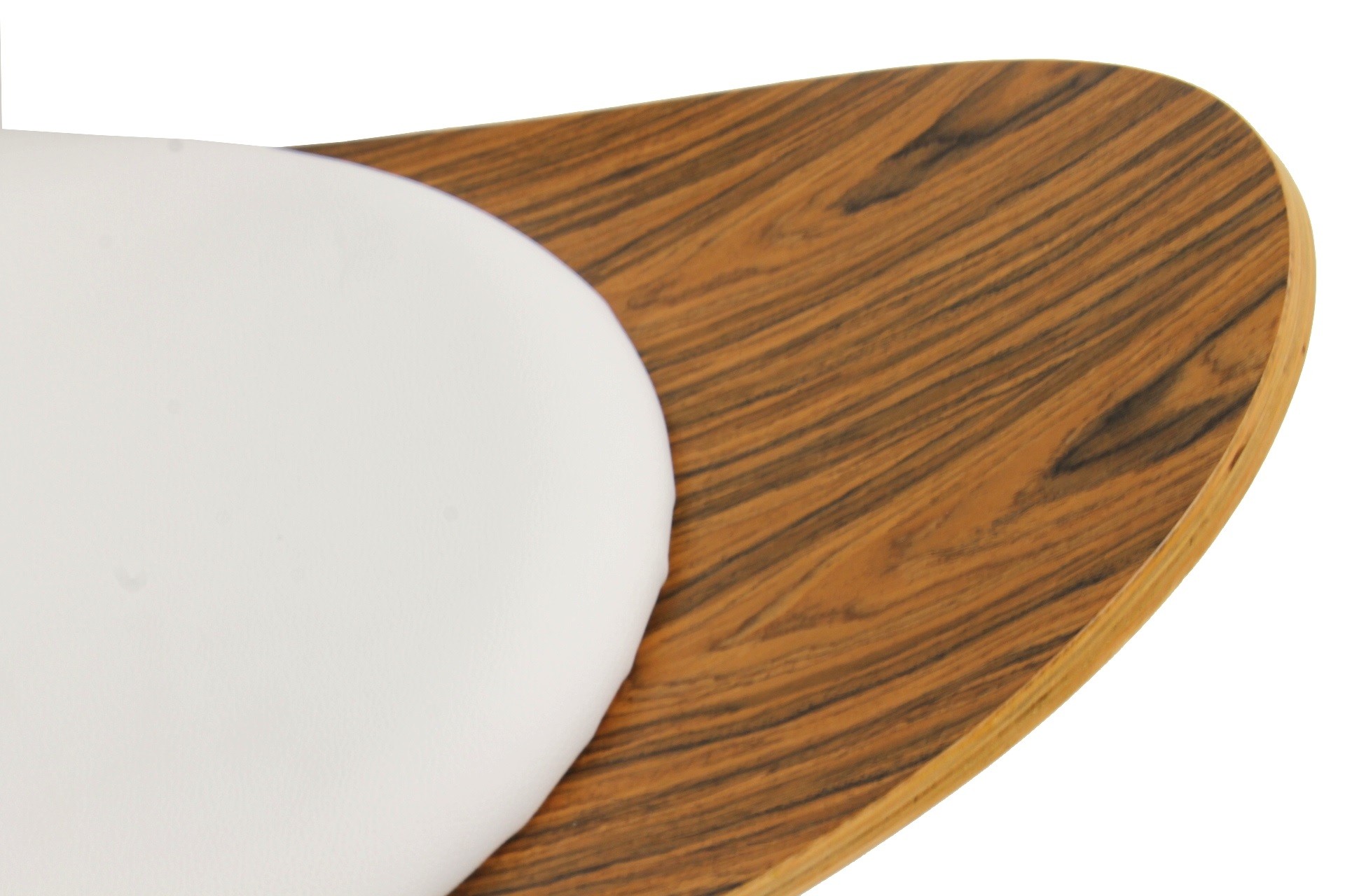 Mide 89 cm de ancho, 79 cm de fondo y 76 cm de altura. La estructura es de madera curvada chapada en palo rosa barnizada, con pad de asiento y respaldo tapizados en similpiel blanca.