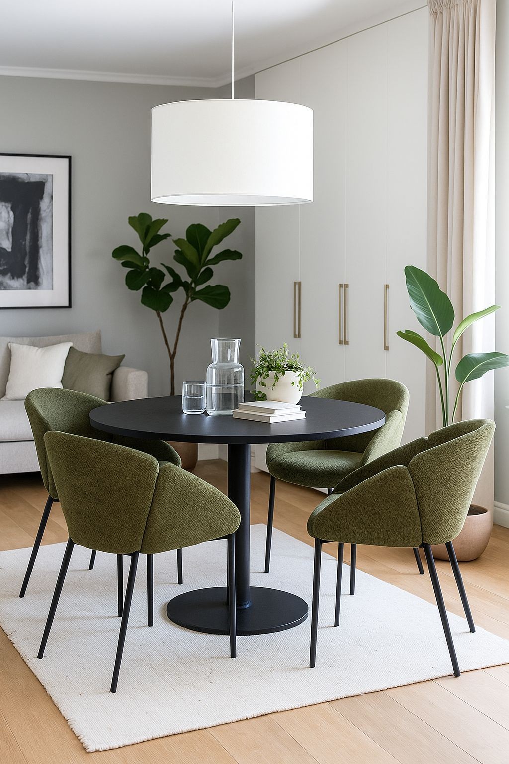 Este modelo funciona como asiento individual en salones modernos, especialmente junto a sofás y sillones de líneas rectas. Su altura de asiento estándar facilita levantarse y sentarse, ideal para zonas de conversación o lectura. El verde bosque aporta calidez sin perder protagonismo visual en el espacio.