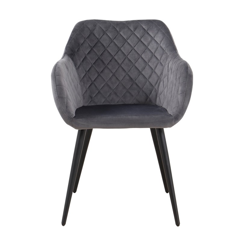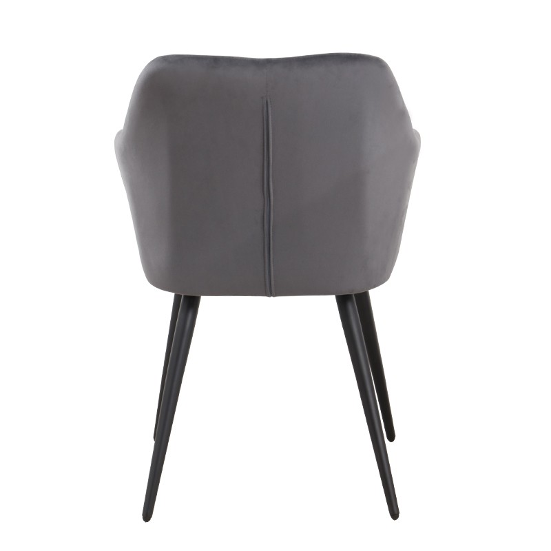 - Material: Asiento y respaldo de madera y goma espuma tapizados en tejido velvet 21 gris oscuro. Patas metálicas con pintura epoxi negra.