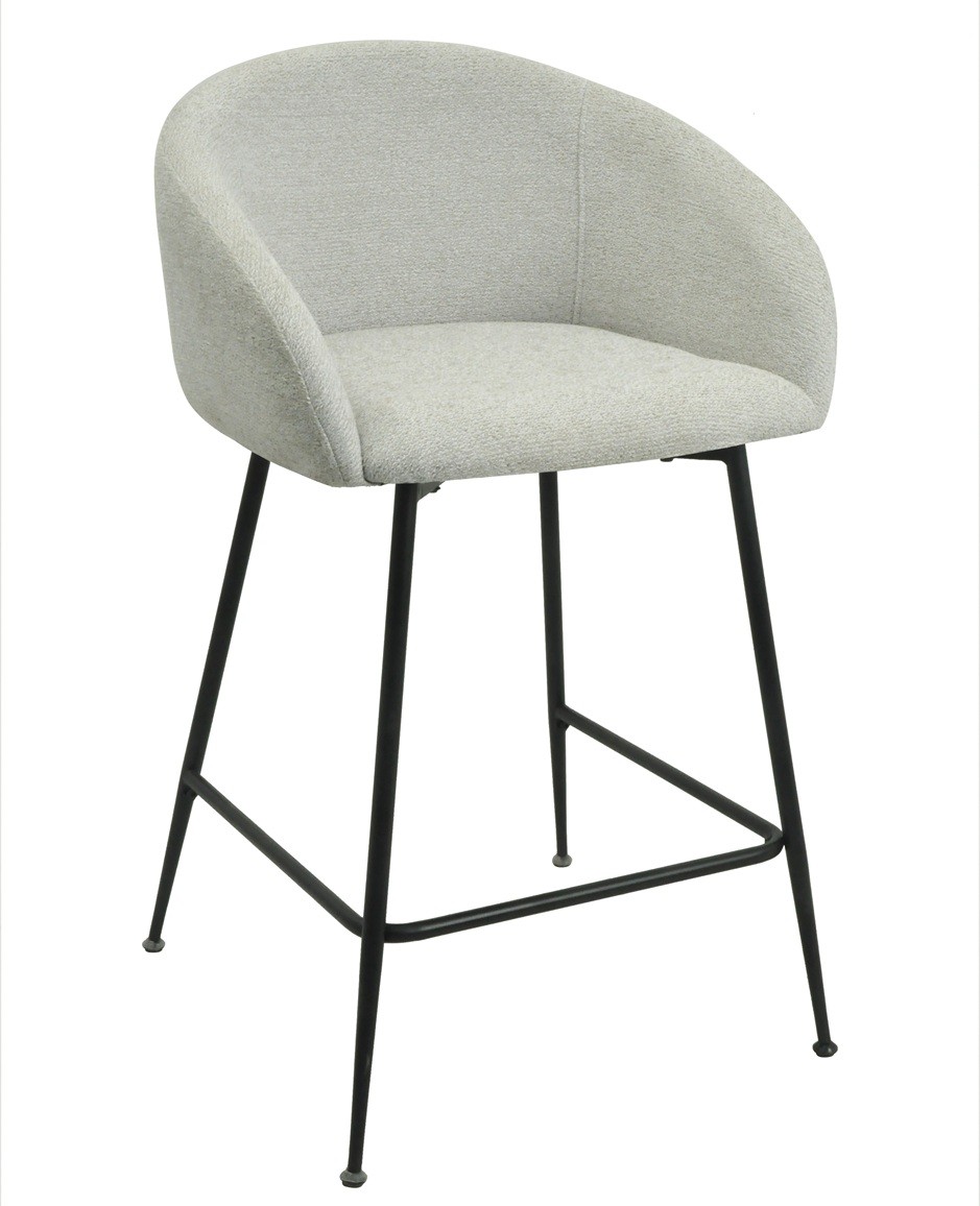 Taburete tapizado en tejido linen gris claro con respaldo, patas metálicas negras y altura de asiento de 72 cm. Ideal para barra de cocina o bar.