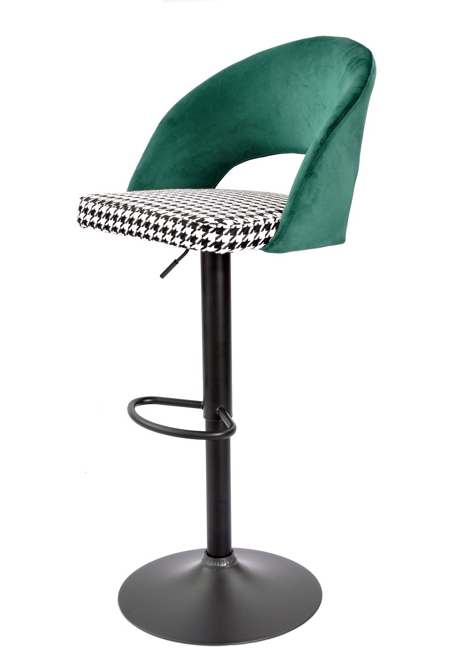 El taburete tapizado TEIDE combina diseño contemporáneo con funcionalidad práctica gracias a su sistema de regulación en altura mediante pistón de gas. Su estructura metálica con acabado epoxi negro aporta robustez y estabilidad, mientras que la combinación de tejido velvet verde en el respaldo y pata de gallo blanco y negro en el asiento crea un contraste visual elegante. El asiento y respaldo están fabricados con madera y goma espuma, ofreciendo un confort óptimo tanto para uso doméstico como profesional. Este taburete tapizado regulable se adapta a diferentes alturas de barra o isla, permitiendo ajustar su altura total entre 89,5 y 109,5 cm según las necesidades de cada espacio.