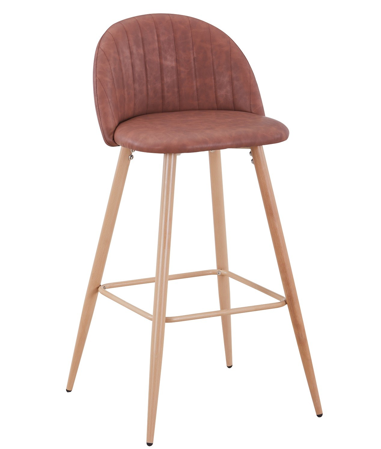 Taburete tapizado con patas metálicas acabado imitación madera y asiento en similpiel vintage cuero. Diseño moderno para cocina, bar y hostelería.